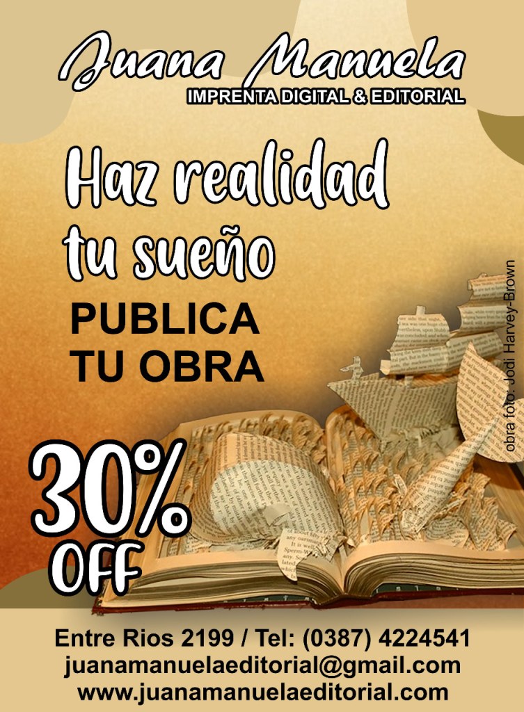 Juana Manuela te ofrece la oportunidad de plasmar tus sentimientos, emociones, vivencias, todos tus escritos en papel, con » La publicación de tú Libro». 30% DE DESCUENTO !!(promoción válido por el mes de julio) para más información comunicate con nosotros.