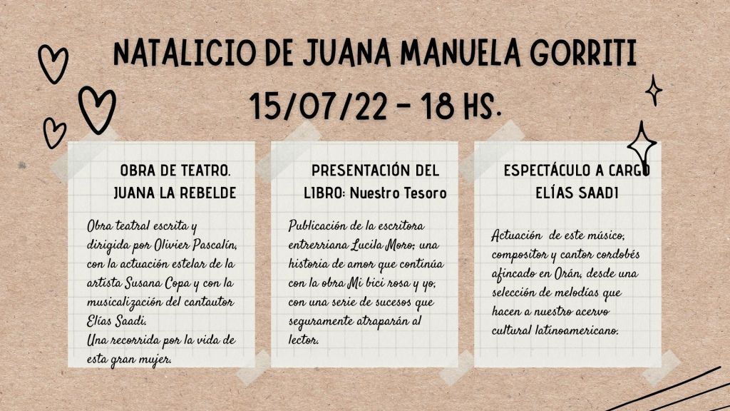 El pasado viernes 15 de julio, conmemorando el natalicio de nuestra querida Juana Manuela Gorriti (15/7/1816), nos convocamos en el Teatro Municipal para desarrollar un espectáculo artístico, combinando las Letras, con el Teatro y la Música, y para ellos vinieron de Entre Ríos nuestros amigos Lucila Moro y Olivier Pascalín, quienes cumplieron el rol de actriz y director, y además se sumó al evento el gran músico y compositor cordobés, radicado en Orán, Elías Saadi.