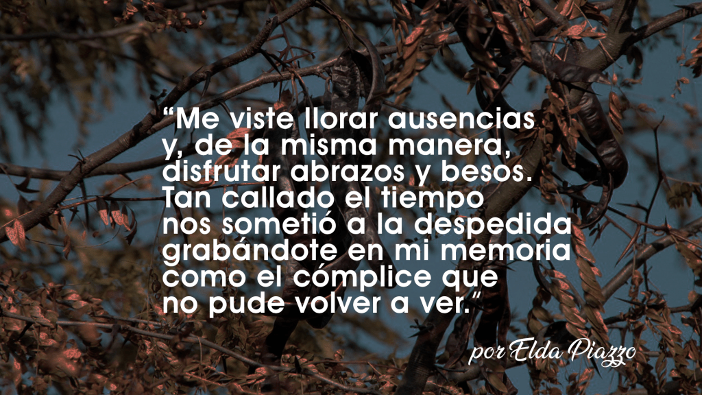 Te recuerdo viejo algarrobo en el patio de esa casa que sin ser mía, todo lo mío guardaba. Eras mi anunciante cuando el viento estaba llorando, la sombra refrescando el aire, el amigo que me esperaba en cada amanecer. Extendías tus hojas en el suelo para verme barrer. Tu soplo hacía correr el hilo de la aguja insolente con la que mamá remendaba. Ofrecías dulces vainas en cada verano, un gajo fuerte para colgar la fiambrera con carne y leche recién ordeñada. Me viste llorar ausencias y, de la misma manera, disfrutar abrazos y besos. Tan callado el tiempo nos sometió a la despedida grabándote en mi memoria como el cómplice que no pude volver a ver.