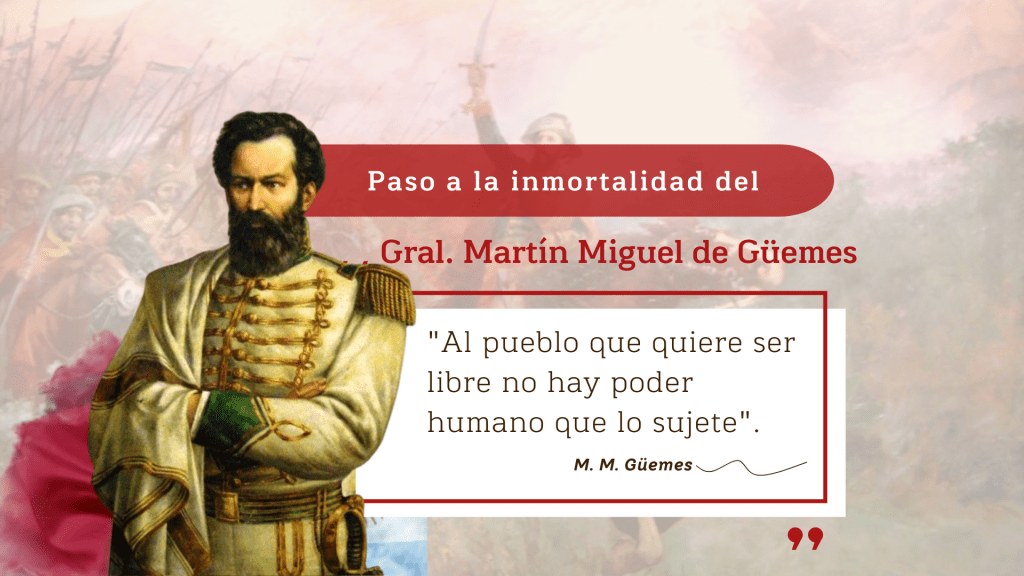 Martín Miguel de Güemes, figura clave de nuestra independencia Nació en Salta el 8 de febrero de 1785 y a lo largo de su carrera militar cumplió un rol fundamental tanto en las guerras civiles como en la Guerra Gaucha, que mantuvo al territorio argentino libre de invasiones realistas. Rol que sin duda lo llevo a se reconocido como el “héroe gaucho” y figura fundamental en la lucha por la independencia argentina. En la actualidad continúa siendo venerada por el liderazgo y las hazañas llevada a cabo durante su lucha.