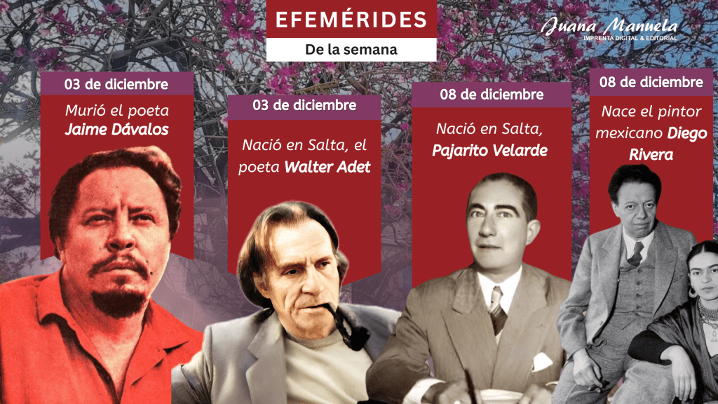 1931: Nació en Salta, el poeta Walter Adet. Publicó en libro: «En el sendero gris», «Antología de la poesía tucumana», «César Vallejo», «El aire que anochece», «El memorial de Jonás», «El escudo de Dios», «La Casa donde soy», otros.