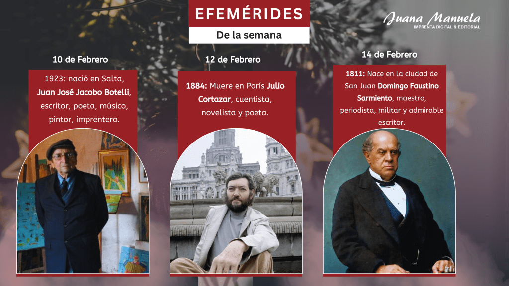 10 de febrero de 1923: nació en Salta, Juan José Jacobo Botelli, escritor, poeta, músico, pintor, imprentero. Publicó entre otros libros «El canto del gallo», «Poemas», «Cuentos y Relatos», «Soloquios y ensayos», «De la tierra y el cielo», «Apuntes en el diario», «Coplas y Refranes de Salta», «Juan CArlos Dávalos» (Testimonios salteños), «Los italianos y descendientes en Salta», «Coplas Salteñas». entre otras obras.