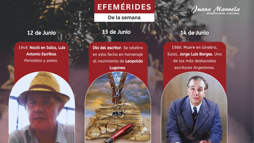 Día del escritor. Se celebra en esta fecha en homenaje al nacimiento de Leopoldo Lugones, fundador de la Sociedad Argentina de Escritores. Nace el 13 de junio de 1874 en Villa de María del Río Seco, Córdoba. Poeta destacado, entre sus poemas más destacados se encuentran Oda a la desnudez; Odas seculares; Poemas solariegos; Las montañas de oro; Crepúsculos del jardín; Lunario Sentimental; Romancero. También escribió obras en prosa como La guerra gaucha; Historia de Sarmiento; El imperio jesuítico; Las fuerzas extrañas; Elogio de Ameghino; Didáctica; Cuentos Fatales, etc.