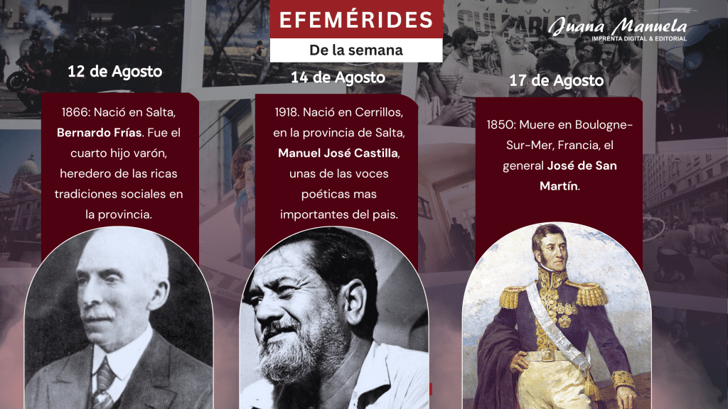 1907: Nació en Salta, Julio Díaz Villalba. Abogado. Ocupó diversos cargos políticos, llegando a ser gobernador interino de Salta. Como hombre de letras fue fecundo. Algunas de las obras publicadas: Antología Vana (1958); Casos del Coya Martín Bustamante (1963 – reeditado en 1964, 1966 y 1970); Tierra Mansa (1966); Bandera sin asta (1976); El reptil verde (1980-novela).