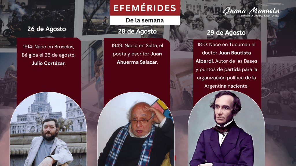1949: Nació en Salta, el poeta y escritor Juan Ahuerma Salazar. Logró importantes premios literarios. Publicó varios libros: «Territorio Libre» (poemas), «Alias cara de caballo» y algunos otros. Colabora con periódicos y revistas especializadas. Autor de la bella novela «La república cooperativa del Tucumán». Dirigió la publicación «El Pájaro Cultural». Es psicólogo.