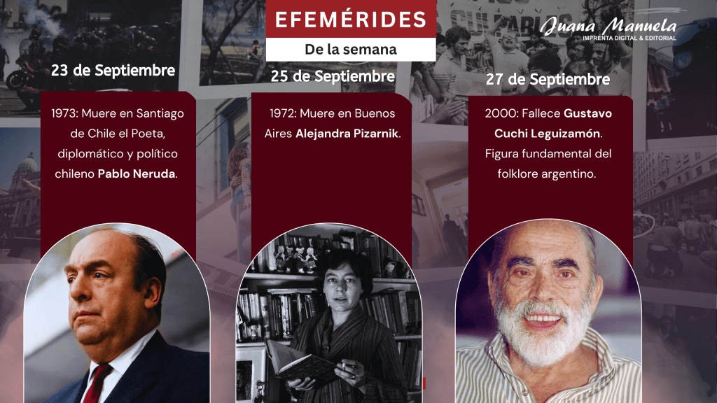 1973: Muere en Santiago de Chile el Poeta, diplomático y político chileno Pablo Neruda. Considerado unos de los más destacados e influyentes poetas del siglo XX, recibió el Premio Nobel de literatura con la premisa de «por una poesía que con la acción de una fuerza elemental da vida al destino y los sueños de un continente».