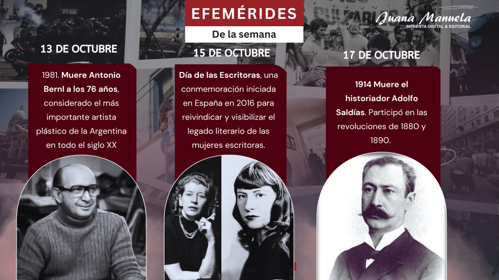 1914 Muere el historiador Adolfo Saldías. Participó en las revoluciones de 1880 y 1890. Fue diputado y senador ante la Legislatura de Buenos Aires, ministro de Obras Públicas de la provincia de Buenos Aires y vicegobernador. En 1910 fue interventor en La Rioja. Entre sus obras figuran Historia de la Confederación Argentina, Papeles de Rosas y Un siglo de instituciones.