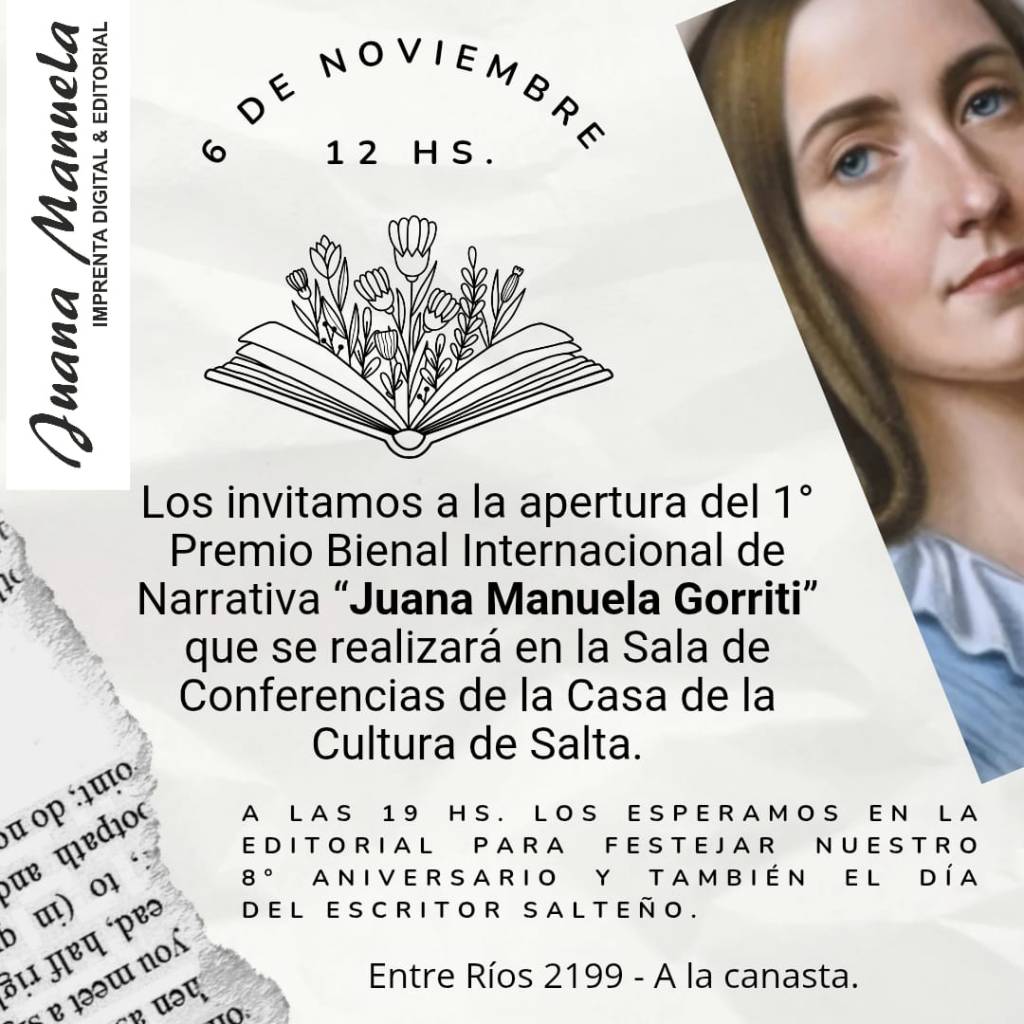 Para conmemorar el día del escritor salteño, fecha que recuerda el fallecimiento de dos grandes escritores como lo fueron Juana Manuela Gorriti y Juan Carlos Dávalos, se llevara a cabo el 1° premio Bienal Internacional de Narrativa «Juana Manuela Gorriti» que se realizara en la Sala de Conferencias de la Casa de la Cultura de Salta, el 6 de noviembre a 12:00 HS del mediodía.