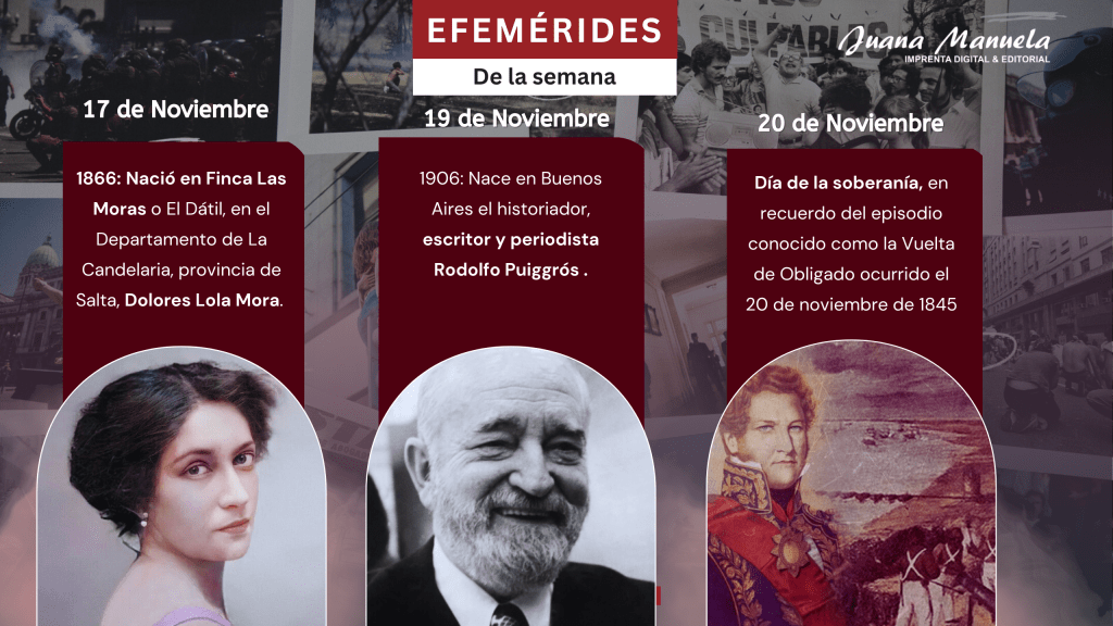 1866: Nació en Finca Las Moras o El Dátil, en el Departamento de La Candelaria, provincia de Salta, Dolores Lola Mora. En homenaje a su natalicio este día fue instituido como Día Nacional del Escultor y de las Artes Plásticas. Triunfadora con su arte en el país y en Europa.