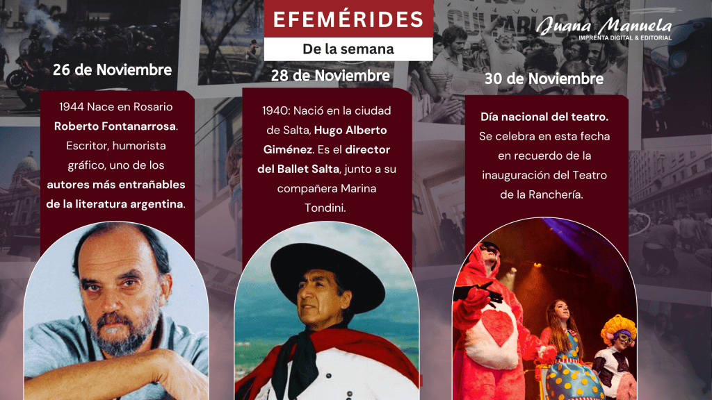 1940: Nació en la ciudad de Salta, Hugo Alberto Giménez. Desde joven se dedicó a la danza argentina. Es el director del Ballet Salta, junto a su compañera Marina Tondini.