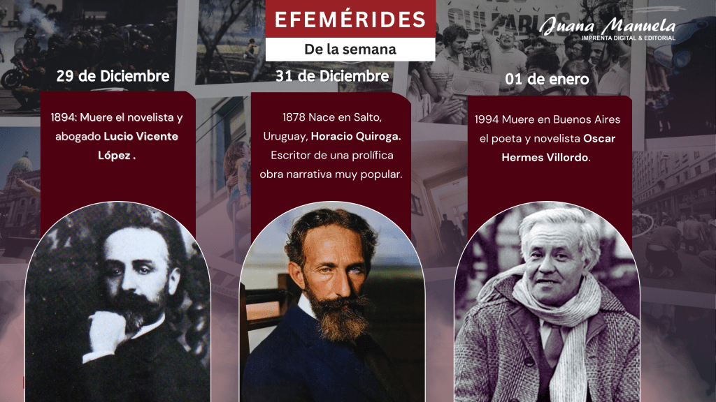 1894: Muere el novelista y abogado Lucio Vicente López como consecuencia de las heridas que sufrió tras un duelo que sostuvo con el coronel Sarmiento. Hijo del historiador Vicente Fidel López y nieto del autor del himno nacional, Vicente López y Planes. Entre sus obras figuran Lecciones de historia argentina, Recuerdo de viaje y La Gran Aldea.