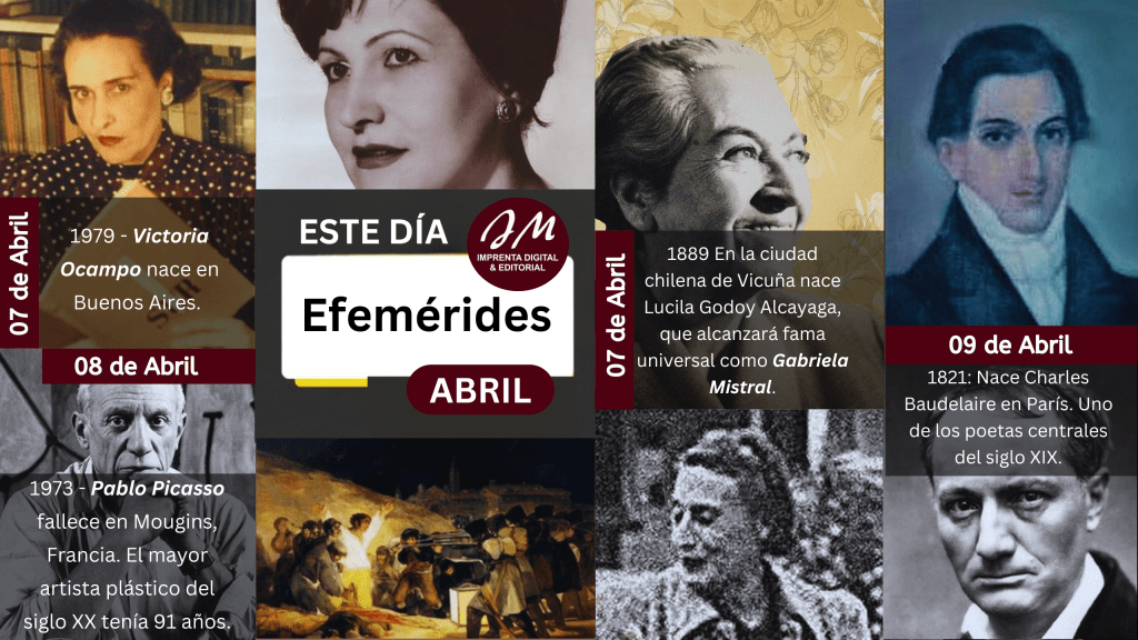 En la ciudad chilena de Vicuña nace Lucila Godoy Alcayaga, que alcanzará fama universal como Gabriela Mistral. Una de las grandes voces de la poesía en castellano del siglo XX, en 1945 fue la primera persona de América Latina en recibir el Premio Nobel de Literatura. Su primer libro fue Sonetos de la muerte, en 1915, al que siguió Desolación, en 1922. Otras obras posteriores son Ternura, Tala y Lagar. Murió en Nueva York en 1957.